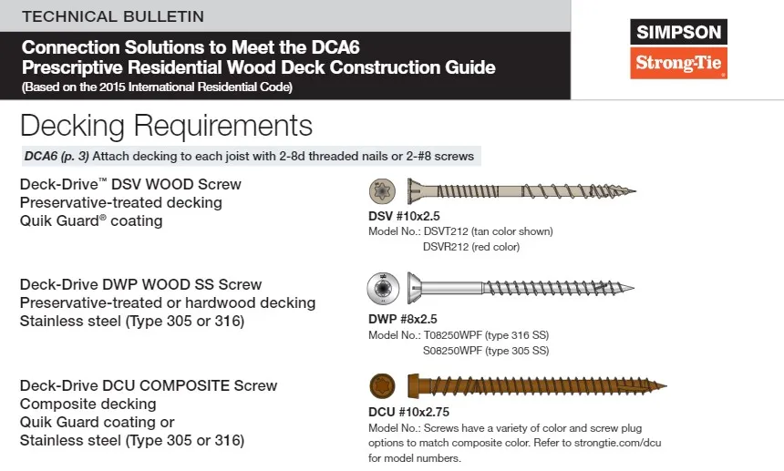Available on the Simpson Strong-Tie website, the Connection Solutions to Meet the DCA 6 Prescriptive Residential Wood Deck Construction Guide tech bulletin is designed as a comprehensive, quick-reference resource for code officials, deck builders, lumberyards, and DIY enthusiasts and includes detailed information, tips, and techniques for using Simpson Strong-Tie fastener, anchor, ledger board, and connector solutions for building decks to the DCA 6 guide.