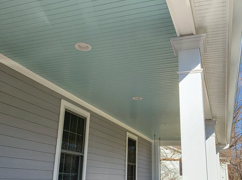 Emulating the haint blue shade currently being revived in the South as a romantic ceiling color, Versatex Building Products has introduced Piazza Blue, a color-through, solid-PVC beadboard.
