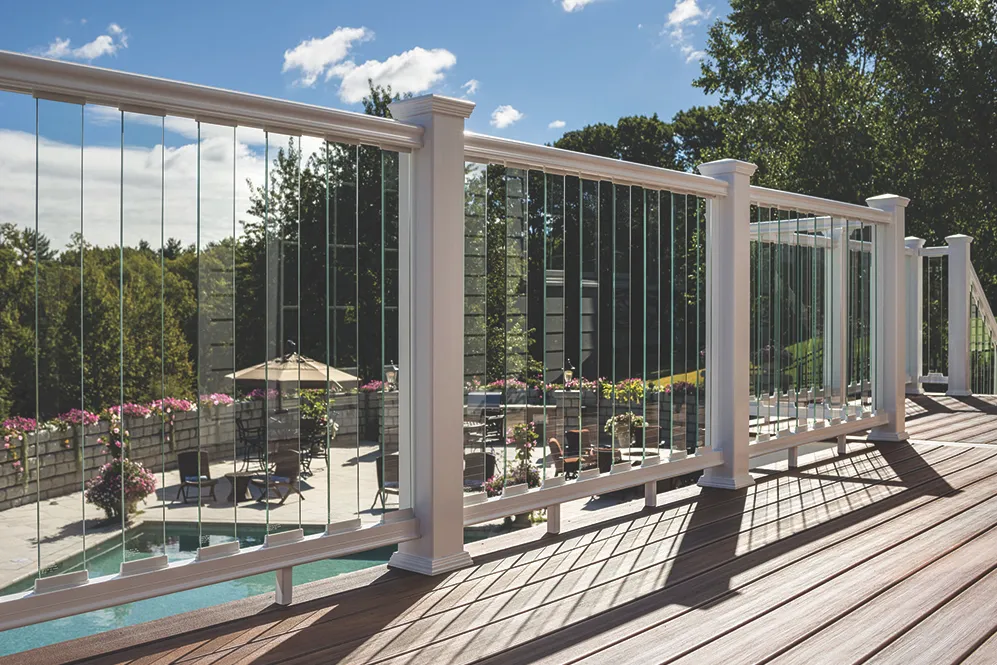 When it comes to glass or acrylic, homeowners have several options. Full acrylic panels can act as a buffer for wind, but are not recommended for beachfront properties where wind-blown sand can ruin the panels. Tempered glass slats allow for some airflow with less damage to the infill. Full glass panels are typically discouraged since they are hard to maintain and cause accelerated fade issues on decking due to prism effect.