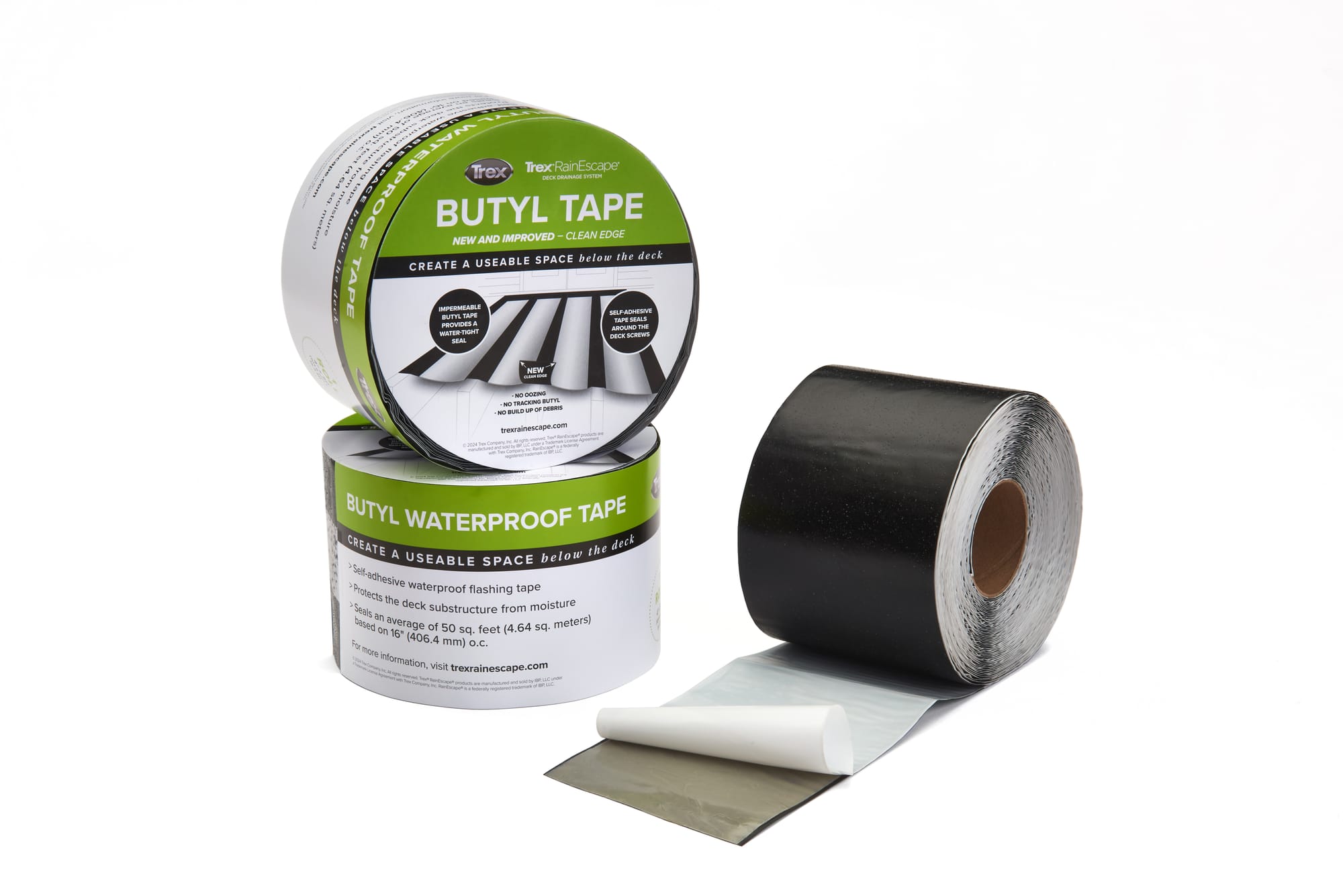 Clean-Edge Butyl Tape is designed specifically for use with the Trex RainEscape system. Installed above the joists of a deck’s substructure, this system employs an integrated network of troughs and downspouts that captures and diverts water away from the deck to create dry, usable space underneath while also protecting the entirety of the foundation from moisture penetration that can lead to wood rot, decay and deterioration. The 4”-wide, self-adhesive, waterproof butyl tape is applied after the system’s troughs are installed and is used to create a watertight seal between the trough overlaps and seals around screw penetrations from the deck boards. The tape also seals around deck screws to hold them in place while preventing rust and corrosion.