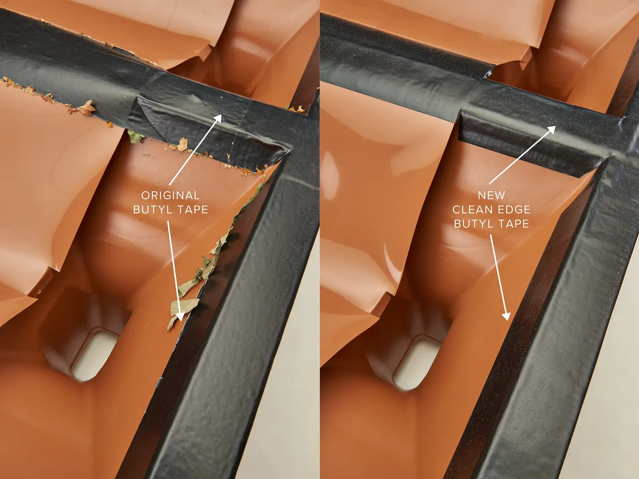 Trex RainEscape Clean-Edge Butyl Tape features a butyl width of 3-¾” on a 4” facer. This updated design leaves 1/8” of clean facing on either side of the butyl, effectively preventing any oozing and ensuring that tape adhesive does not get tracked onto the decking or into the house. The butyl-based adhesive also won’t dry out or curl up and hold water like other adhesives.