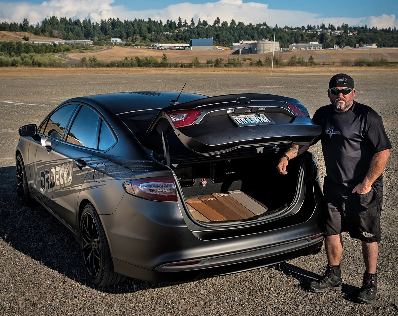As far as the rest of the trunk, we have no room for a spare tire because custom cut and engraved decking samples line the floor. Each piece was painstakingly cut, cut and re-cut to form perfectly to the contours of the trunk. Clients can remove them for inspection to help guide in their decision as to which brand and color of decking product they may want to use on their own backyard work of art.