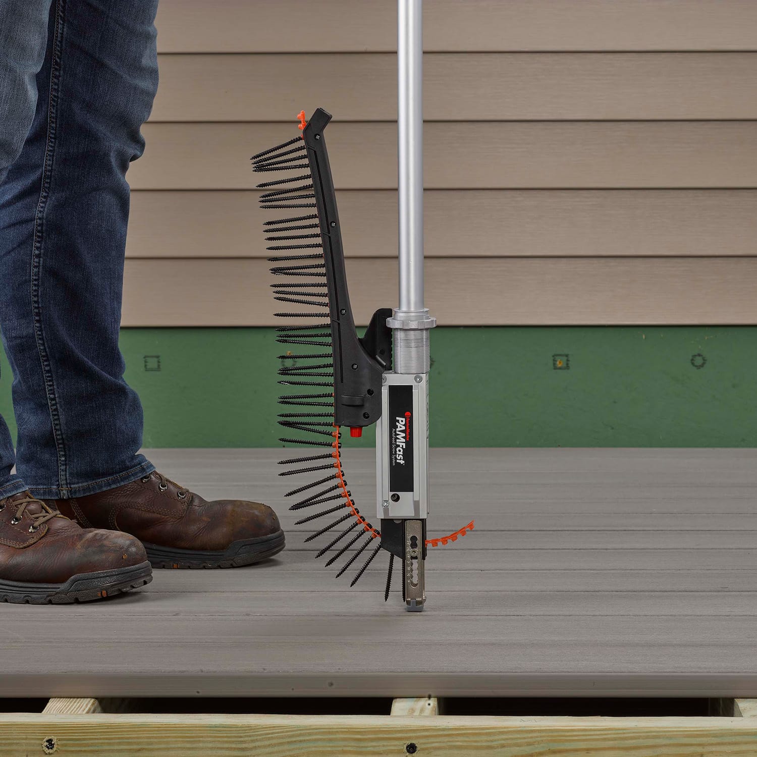 The PAMFast AutoFeed System provides smooth, consistent fastener installation without jams, setting Cortex screws to the perfect depth to allow for plug installation. The increased drill consistency and stability provided by the PAMFast Tool eliminates the need to predrill in Trex Decking. The tool can be used in its stand-up configuration, eliminating bending and enhancing ergonomics and comfort, or it can be converted to a short tool, bringing the PRO closer to the application for precision placement.