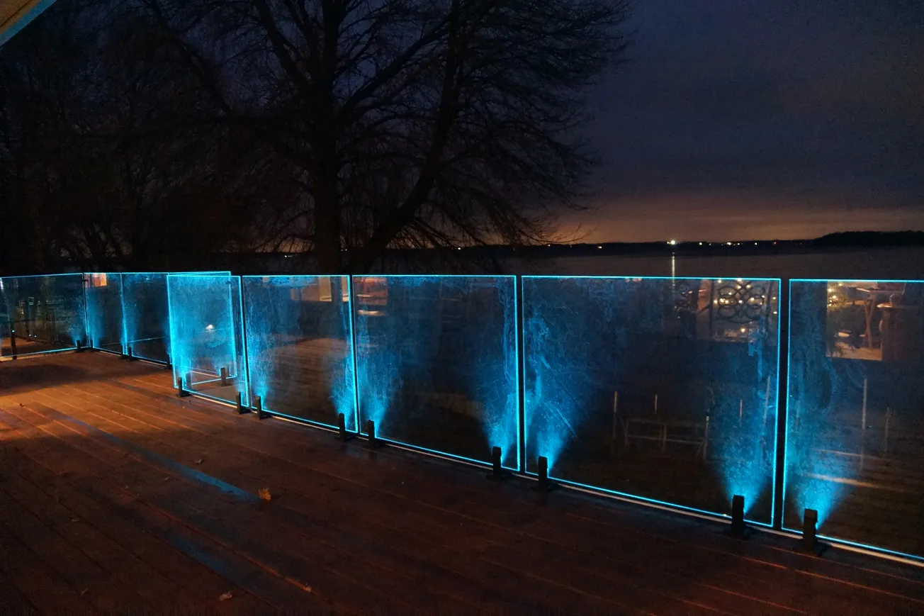 IG Railing is built on a base mount, called a spigot that houses a Wi-Fi controlled LED light system, and holds 1/2" (12mm) tempered low-iron glass. At night, the low iron glass and LED lighting allows illumination to flow throughout the panels. Glass connector accessories, top rail and spigots are available in matte black or polished finishes.