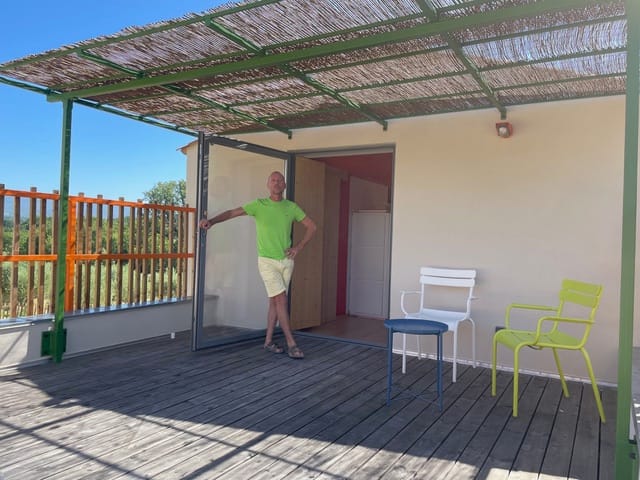 Architect and designer Matali Crasset renovated the historic building with a distinctive contemporary approach. The goal was to create elegant, bright guesthouses with bathrooms offering breathtaking views, while blending the old and the modern. The architect preserved some of the original floors, beams, and materials, which now feature new furniture and concrete floors. Raw concrete openings now redefine the facades. A magnificent living room and a convivial kitchen complete the amenities.