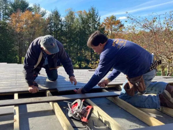 Tom Silva, General Contractor, sets CAMO EDGE clips for fastening as Charlie Silva locks in MoistureShield Meridian deck boards in Citadel color with CAMO LEVER.