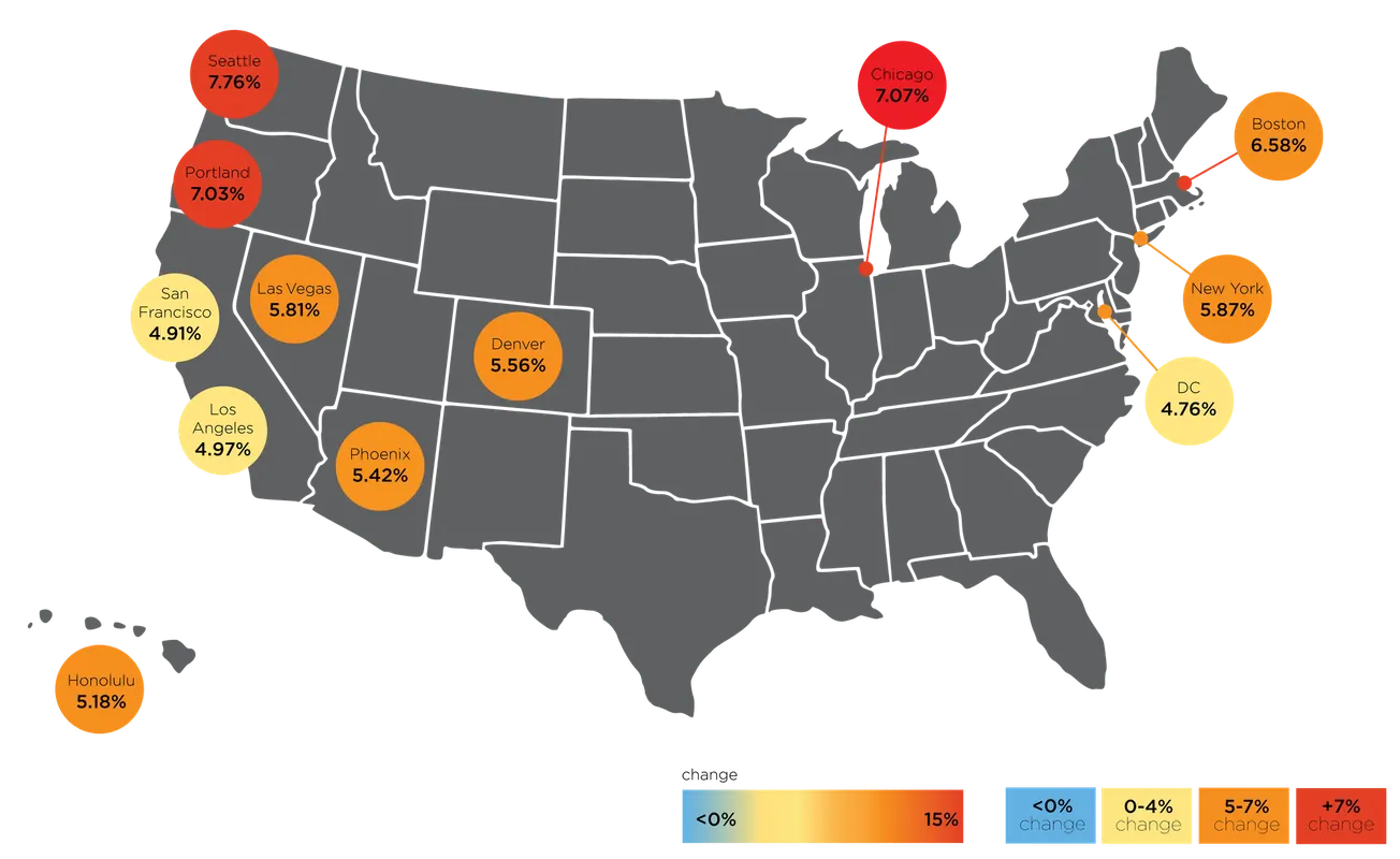 With current data from mid-Q4 2023, the latest quarterly cost report by Rider Levett Bucknall (RLB) shows that the national average increase in construction costs was 1.32 percent over the previous quarter, with Boston, Chicago, Honolulu, Portland, Seattle, and Washington D.C. experiencing increases over the national average this quarter. Denver, Las Vegas, Los Angeles, New York, Phoenix, and San Francisco experienced gains that were less than the national average.