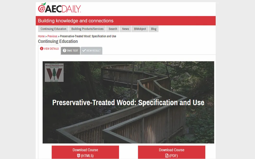 To review the courses, go to AECDaily.com and search for “preserved wood.” You must complete the free registration to download courses. To receive CEU credits, users must complete a 10-question test at the end of the course.